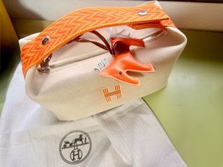 Borsa da toilette Hermes con un design elegante. Colore principale beige con dettagli arancioni. Include un charm a cavallo arancione. Viene con la sua borsa protettiva.