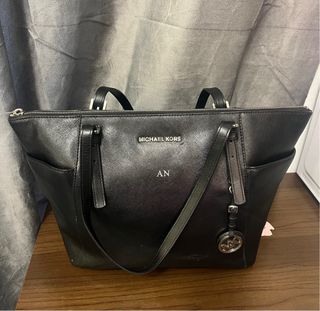 Elegante borsa Michael Kors in pelle nera. - Logo MK sul charm. - Dettaglio con iniziali AN stampate. - Tasche esterne laterali.