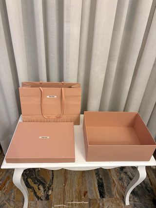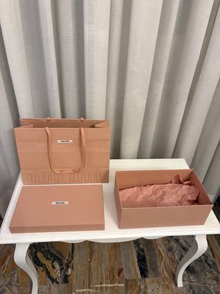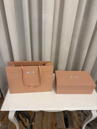 Set composto da busta e scatola per scarpe Miu Miu. la scatola misura 31 × 17,5 × 11,5 e la busta 35 × 25 × 14 i due prodotti sono vendibili anche singolarmente.