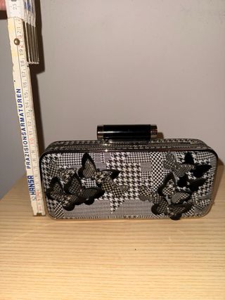 Borsa rigida Pinko con fantasia pied de poule e applicazioni a forma di farfalle. - Fantasia pied de poule. - Dettagli a farfalla.