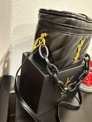 Elegante necessaire del marchio Yves Saint Laurent. Design imbottito. Logo YSL dorato. Catena decorativa. Cinturino rimovibile.