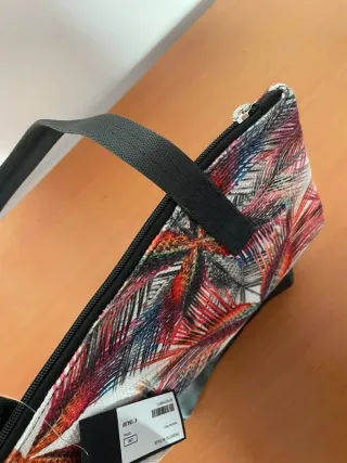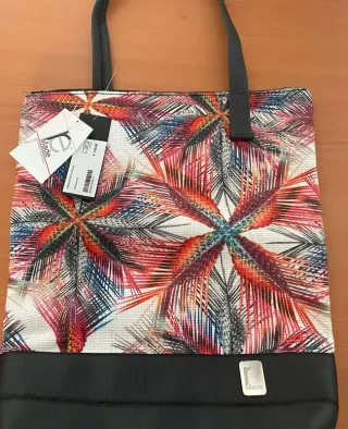 Borsa tote con un vivace motivo floreale e una base in sintetica nera. Borsa per donna molto capiente. Foderata all'interno con 2 tasche per cellulare e una ampia tasca con chiusura a zip. Nuova con etichetta. Produzione italiana Re-made Lab Untraditional Bag's. Nuova con cartellino. Chiusura a cerniera. Lunghezza totale con manico 63 cm circa. Dimensioni : - Larghezza: 33 cm - Altezza:40 cm. - Profondità: 9 cm - Manici neri. - Dettaglio logo sulla base.