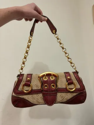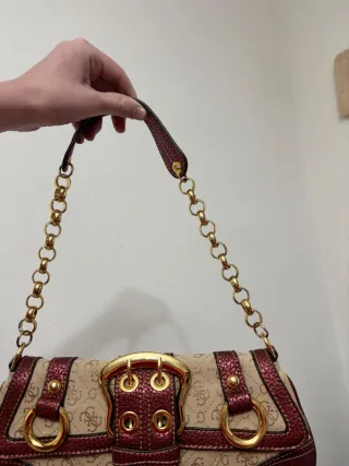 Bellissima borsa GUESS vintage Indossabile sotto spalla, a forma di baguette In tessuto monogramma colore sabbia I bordi,la tracolla e i dettagli sono in ecopelleartellata metallizzata colore bordeaux L' elemento più distintivo é la grande fibbia centrale decorativi dorata sul davanti La chiusura avviene tramite un bottone magnetico La borsa presenta vistosi anelli laterali e borchie dorate arrotondate É composta da una catena robusta,a maglie larghe interrotta da una fascia in ecopelle Imponente ,autentica e perfetta,senza difetti Vero vintage Prezzo trattabile, contattami per qualsiasi domanda Misure: 30x15x5