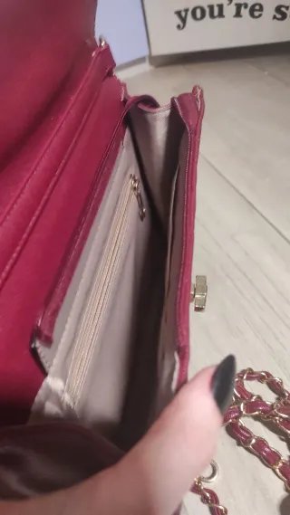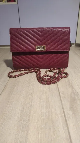 Borsa elegante con un design trapuntato a spina di pesce e una chiusura dorata. La tracolla a catena aggiunge un tocco di classe. - Materiale: similpelle - Colore: bordeaux - Dettagli metallici dorati - Tracolla a catena intrecciata