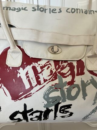 Borsa bauletto della linea Magic Circus di Piero Guidi, caratterizzata da una stampa vivace e colorata su fondo bianco. - Design unico con stampa a tema. - Manici e dettagli in pelle cuoio. - Chiusura superiore con zip. Praticamente nuova