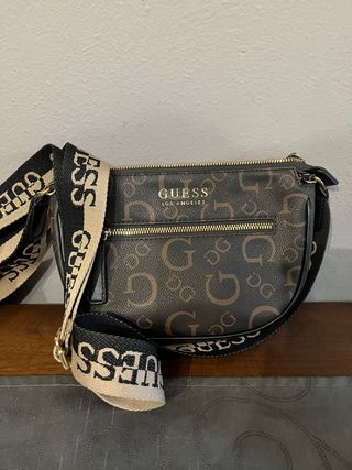 Borsa Guess con stampa monogramma. - Tracolla regolabile con logo. - Tasca esterna con zip. - Dettagli dorati.