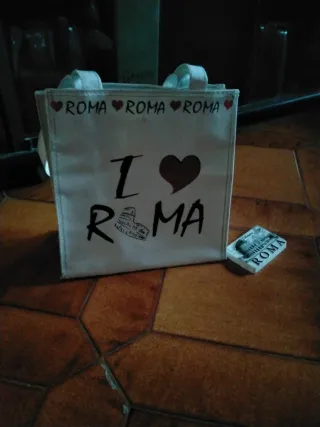 Simpatica borsetta con stampa Roma e un cuore rosso. Inclusa in omaggio una calamita a tema Roma. - Borsetta con manici. - Stampa Roma e cuori. - Magnete Colosseo Roma in omaggio.