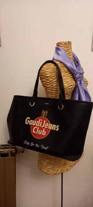 Borsa shopper nera con logo Gaudi Jeans Club. - Logo rotondo rosso con aquila e scritta Gaudi Jeans Club. - Scritta Only for the Best in corsivo bianco. - Manici neri con dettagli metallici. - Fodera interna leggermente macchiata.