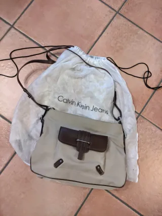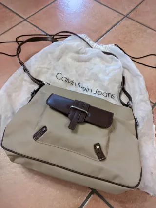 Borsa Calvin Klein con dettagli in pelle. - Colore principale beige. - Inserti e tracolla in marrone. - Tasca frontale con chiusura a fibbia. Elegante borsa da spalla in tessuto, colore beige, con rifiniture in pelle marroni, dei primi anni 2000. Pratica e comoda, da sfruttare per ogni tipo di situazione: casual o professionale. Ideale anche per la stagione estiva, grazie a gradazioni cromatiche sfruttabili sempre. Chiusura con cerniera con linguetta in pelle con logo Calvin Klein. Tasca anteriore con apertura magnetica a incastro, rifinita in pelle con fibbia griffata Calvin Klein. Grande Tasca posteriore con apertura magnetica