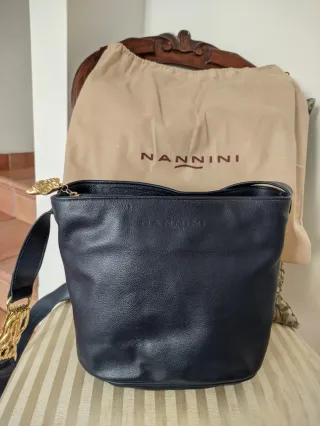 Borsa a secchiello Nannini in pelle blu scuro. Un accessorio elegante. - Materiale: Pelle - Colore: blu scuro Con la sua estetica minimalista non risente del passare degli anni, rimanendo un accessorio elegante e casual, un vero evergreen del marchio italiano. Interno foderato in pelle nera. Tasca interna con cerniera ed etichetta con logo Giannini. Chiusura con zip a forma di stella in metallo dorato. Manico in pelle con inserti in metallo dorato. Fodera proteggi borsa in tessuto. Originale, made in Italy, mai usata. Altezza: 20 cm Larghezza: 27cm Profondità: 10 cm