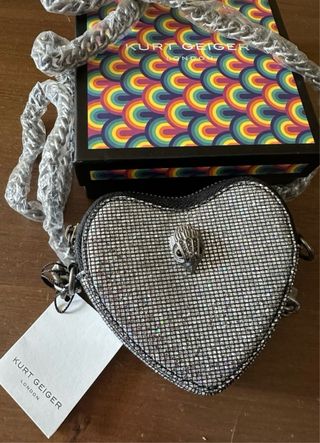 Borsa a forma di cuore Kurt Geiger, scintillante e nuova. - Design a forma di cuore. - Dettaglio con testa di aquila. - Catena metallica. - Finitura glitterata.
