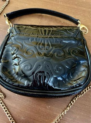 Borsa CafeNoir in vernice nera, con dettagli dorati. Si presenta in buone condizioni. - Design trapuntato. - Chiusura con patta e bottone a pressione. - Tasche frontali con chiusura a bottone. - Logo dorato sul davanti. - Tracolla a catena dorata. - Misure 35 cm x 22 cm - Unico segno di usura la linguetta per aprire la zip
