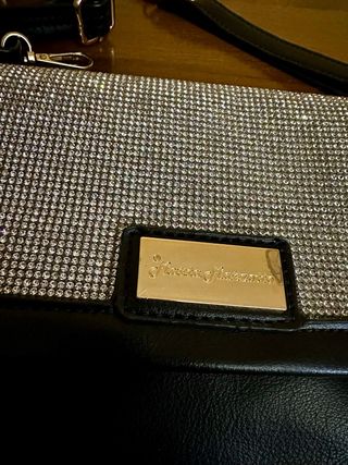 Elegante borsa Marta Marzotto con dettagli glitter e pelle. - Tracolla regolabile inclusa. - Manico da polso in pelle. - Logo Marta Marzotto sul fronte.