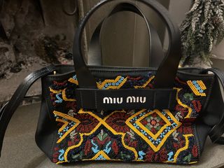 Borsa Miu Miu con un design unico e colorato, arricchita da perline. - Dettagli ricamati con perline. - Manici in pelle. - Logo Miu Miu sul davanti.