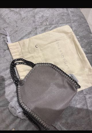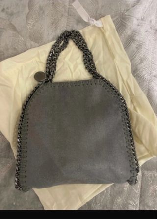 Borsa a tracolla mini di Stella McCartney in tonalità grigia. Presenta una catena metallica che funge da manico e bordi decorati con la caratteristica maglia. - Materiale scamosciato. - Dettagli in catena metallica.