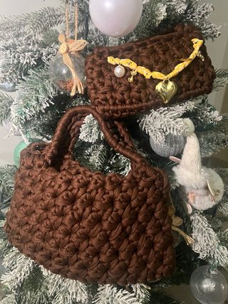 Set composto da una borsa a mano e un borsello coordinati, realizzati all'uncinetto. - Borsa a mano con manici. - Borsello con chiusura e decorazioni argentate