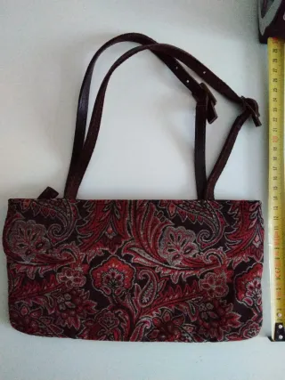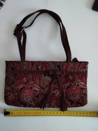 Elegante borsetta Marina Rinaldi con una fantasia vivace. - Tessuto jacquard con motivi floreali. - Dettagli in pelle scamosciata. - Chiusura con zip. - Tracolla regolabile.