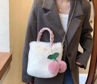 Morbida borsetta in eco-pelliccia bianca, perfetta per aggiungere un tocco di stile. - Manico intrecciato color rosa. - Ciondolo a forma di ciliegia con pompon rosa. - Tracolla a catena metallica.