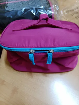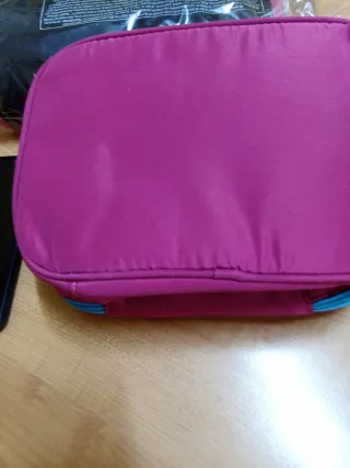 Beauty case nuovo, perfetto per organizzare i tuoi trucchi e prodotti da bagno. - Colore fucsia vivace. - Dettagli con zip azzurra. - Manico superiore per un facile trasporto.