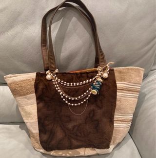 Borsa unica realizzata a mano, con un affascinante stile vintage. - Molto capiente. - Patchwork di tessuti in tonalità beige e marrone. - Dettagli decorativi con perle e filo da cucito. - Manici in ecopelle marrone.