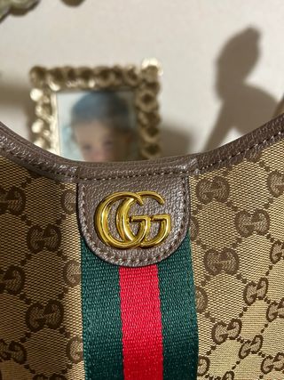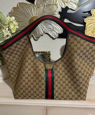 Borsa tote Gucci modello Giglio, un accessorio iconico e versatile. - Logo GG dorato. - Striscia verde e rossa. - Manici in pelle marrone. - Tessuto monogram GG.