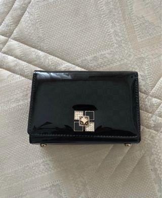 Elegante pochette in vernice nera, perfetta per completare un look sofisticato. Dotata di una catena dorata per indossarla comodamente a spalla o a tracolla. - Finitura lucida in vernice. - Dettaglio frontale con strass e chiusura - Catena metallica color oro.