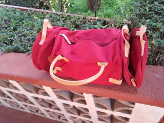 Questo pratico borsone da viaggio componibile Made in China è composto da borsa principale in colore rosso con rifiniture in colore marrone chiaro. Apertura con cerniera. Separatore interno. È possibile applicare lateralmente ulteriori due borsette per aumentarne gli scomparti e gli spazi, grazie a due bottoncini per lato...anch'esse in tinta rossa. Una con zip verticale e l'altra con apertura superiore. Tutte e tre le componenti sono utilizzabili separatamente e singolarmente per la presenza su ognuna di manici in PVC. Dimensioni BORSA PRINCIPALE -35x35xh30 cm ca. BORSETTE LATERALI - Diam. 24 cm ca. TOTALE: 55 cm ca.
