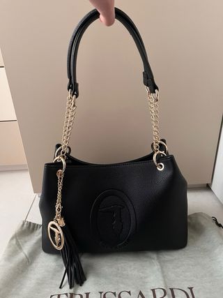 Elegante borsa Trussardi in pelle nera, perfetta per ogni occasione. Dotata di tracolla regolabile e dettagli dorati. - Logo Trussardi impresso sul fronte. - Charm con logo e nappina pendente. - Manici superiori e tracolla a catena dorata. Borsa nuova mai usata. Dimensioni in foto allegate