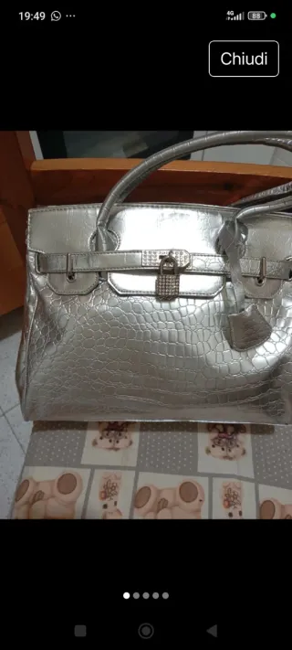 Borsa elegante con finitura lucida e texture effetto coccodrillo. - Chiusura con lucchetto decorativo. - Dettagli metallici. - Manici rigidi.
