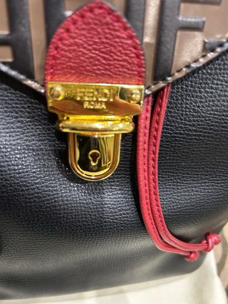 Zainetto Fendi in vera pelle, un accessorio elegante e versatile. - Design bicolore nero e marrone. - Dettagli in pelle rossa. - Logo Fendi iconico. - Chiusura a girello dorata.