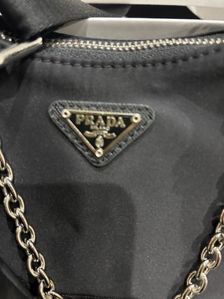 Tracollina Prada in tela, un accessorio versatile e di tendenza. - Logo triangolare in metallo. - Dettagli in catena argentata. - Pochette removibile con zip. - Tracolla regolabile in tessuto.