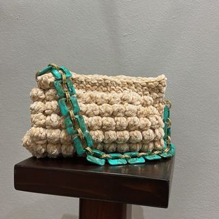 Borsa artigianale realizzata all'uncinetto, con un design unico e dettagli curati. - Colore principale beige. - Tracolla a catena color verde. - Texture a rilievo.