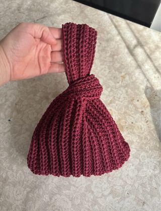 Borsa a mano con un design unico a nodo giapponese. - Colore rosso intenso. - Realizzata all’uncinetto