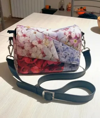 Borsa a tracolla Desigual con una stampa floreale vivace e colorata. - Design patchwork con diverse fantasie floreali. - Tracolla regolabile e removibile in ecopelle nera. - Chiusura con zip. - Dettagli metallici argentati.