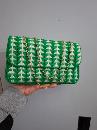 Borsa fatta a mano su rete canvas con un bel motivo. Chiusura a clip. Colore verde e bianco. - la si può indossare come si desidera. ( tutte le misure in foto ) - Manico a catena dorata.