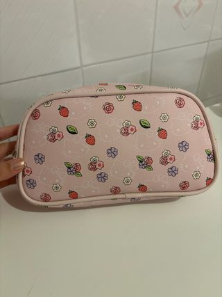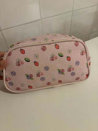 Simpatica pochette con fantasia di fragole e fiori. - Chiusura con zip. - Fodera interna. - Design con fiocchi e fragole.