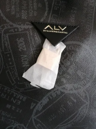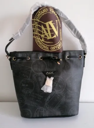 Borsa a secchiello ALV by Alviero Martini, nuova e originale. Presenta una stampa all-over ispirata ai timbri dei passaporti. - Chiusura con coulisse. - Dettagli in metallo dorato. - Tracolla regolabile.