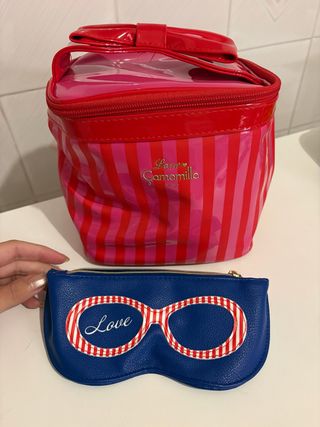Set composto da beauty case e pochette. - Beauty case a righe verticali rosa e rosse con fiocco. - Pochette blu a forma di occhiali con scritta Love.