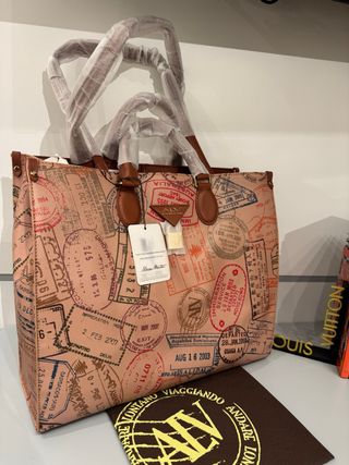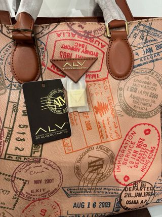 Borsa nuova con stampa passaporti, un accessorio unico per chi ama viaggiare. - Design ispirato ai timbri dei passaporti. - Manici in pelle marrone. - Logo ALV impresso. Ecopelle