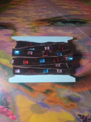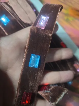 Vendo nastro in velluto colore marrone con pietre decorative multicolor (rosso, blu, rosa), molto scenografico. Ottimo per cucito creativo, decorazioni, abiti, accessori, costumi, borse, scrap, bomboniere. 📏 Misure: Larghezza: 3 cm Lunghezza totale: 6 metri e 93 cm (circa 6,93 m) ✅ Vendo tutto il lotto insieme come da foto.