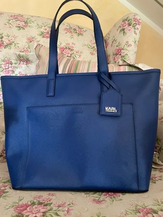 Borsa tote in ecopelle blu di Karl Lagerfeld. Un accessorio elegante e capiente, perfetto per ogni occasione. - Logo Karl Lagerfeld impresso. - Tasca esterna. - Dettaglio con targhetta. - Manici in pelle.ben tenuta,segni angoli /manici come foto