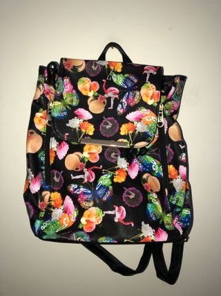 Zaino donna con stampa vivace e dettagli unici. - Design vintage. - Stampa multicolor con farfalle, fenicotteri e fiori. - Chiusura con zip e patta. - Spalline regolabili.