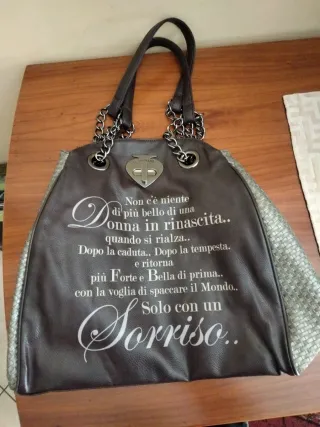 Borsa Le Pandorine con una bellissima frase Non c'è niente di più bello di una donna in rinascita.. quando si rialza.. Dopo la caduta.. Dopo la tempesta. e ritorna più Forte e Bella di prima.. con la voglia di spaccare il Mondo.. Solo con un Sorriso... - Materiale: Pelle. - Dettagli in catena e inserti argentati. Presenta una piccola usura sul dietro della borsa come da foto