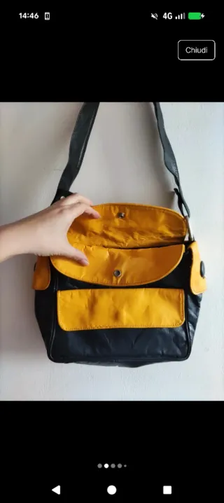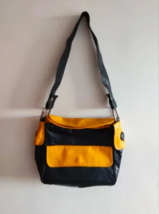 Borsa vintage a spalla in pelle gialla e blu. È possibile chiuderla in vari modi e presenta una tasca esterna. Usata parecchio ma è in ottime condizioni #vintage #verovintage #vintagestyle