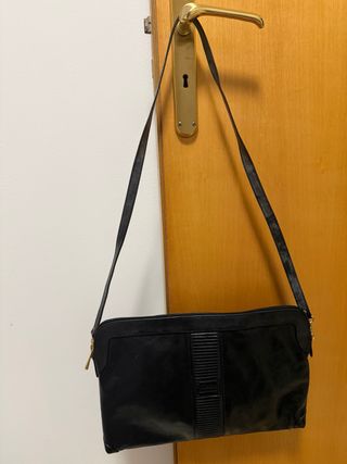 La borsa mostrata nell'immagine è una borsa a tracolla o pochette in pelle nera. È un modello italiano vintage, caratterizzata da una sezione centrale decorativa a coste verticali. Stile: Borsa a tracolla convertibile, che può essere utilizzata anche come pochette rimuovendo o nascondendo la tracolla sottile. Dettagli: Hardware (cerniere, ganci) color oro.
