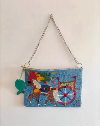 Bellissima borsa / pochette antica sartoria, realizzazione artigianale con frontale immagine del carretto siciliano interamente a perline e retro stoffa (in cotone) con fantasia colorata sui toni dell'azzurro. Presenta cartiera e catenina per poterla indossare a spalla o come pochette a mano. Nuova con cartellino. Ottima idea regalo. Dimensione 30cmx21cm #colour #lavorazioneartigianale #anticasartoria #summer #present