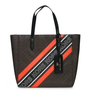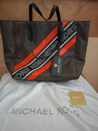 Borsa tote Michael Kors con un design distintivo. - Motivo monogramma marrone. - Strisce diagonali arancioni e bianche. - Logo Michael Kors sul tag. - Manici neri. Se interessati ho anche il portafoglio da abbinare nero.