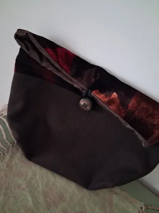 Elegante pochette realizzata in tela e velluto. Capiente 20 per 24 cm Nuova - Tessuto principale in tela marrone. - Dettagli in velluto con fantasia a scacchi nei toni del rosso e marrone. - Chiusura con bottone.