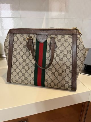 Borsa di marca Gucci con il classico motivo GG Supreme. - Colore: beige e marrone. - Dettagli in pelle. - Striscia verde e rossa iconica.