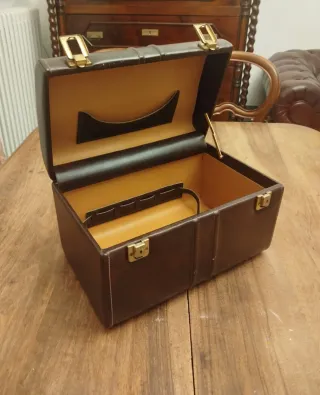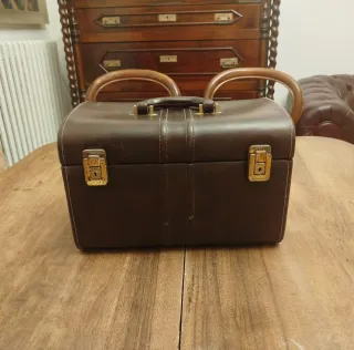 💼 Valigetta / Beauty Case Vintage Marrone Scuro in cuoio - Stile Retrò 📝 Descrizione del Prodotto Oggetto: Elegante Valigetta, Bauletto o Beauty Case Vintage. Stile: Retrò / Borsone da Dottore in miniatura. Materiale: Cuoio con impunture chiare a contrasto. Dettagli: Chiusure laterali e attacchi del manico in Metallo Dorato Lucido. Interno foderato in tessuto color ocra/beige chiaro, pulito e ordinato. Piccolo scomparto interno/tasca fissa sul coperchio. Stato: OTTIME CONDIZIONI VINTAGE (come da foto). #valigetta #beautycase #bauletto #vintage #retrò #marrone #similpelle #cuoio #borsavintage #valigia #arredamento